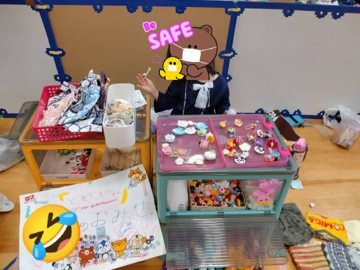 うちの姪っ子はちょっと学習障害があり計算が苦手なので、出品物はすべて10円にしたのですが。全員が10円を払ってくれるわけもなく。おつりが発生するものになると事前に渡しておいたおつり表を見て、頑張って対応していたようです。私的にツボだったのは看板(?)一番上に書いてあった